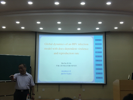 徐瑞教授报告了关于HIV传染病模型全局动力学性态的一些研究成果,这类问题的动力学复杂体性是近年来的研究热点与难点。徐教授特别对如何分析解的全局渐近性做了细致的讲解。