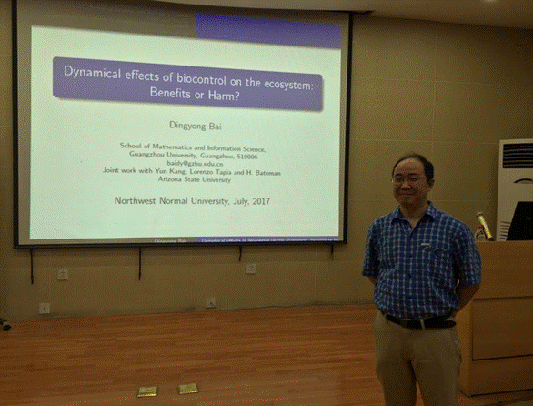 7月25日,应万象城老虎机官方网站邀请,广州大学数学与信息科学学院白定勇教授来万象城进行学术交流,并在教学9号楼C101学术报告厅作了题为《Dynamical effects of biocontrol on the ecosystem: Benefits or Harm》的学术报告。相关专业教师、研究生以及来自兄弟院校的学者20余人参加了报告会。