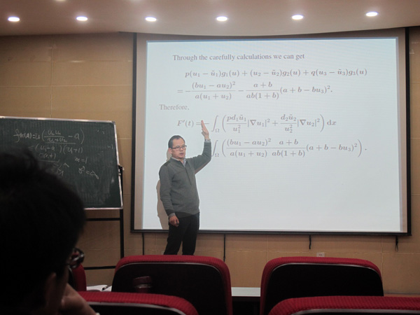 报告会上,王明新教授首先介绍了一种李雅普诺夫泛函直接方法,用于研究反应扩散方程(包括部分退化的反应扩散方程和时滞反应扩散方程)的唯一平衡解的稳定性。然后介绍了一个抽象框架和结果,最后应用到一类比率依赖型两捕食者一食饵系统。 整个报告会内容丰富、难点与关键技术被逐次分解,使在场师生受益良多。