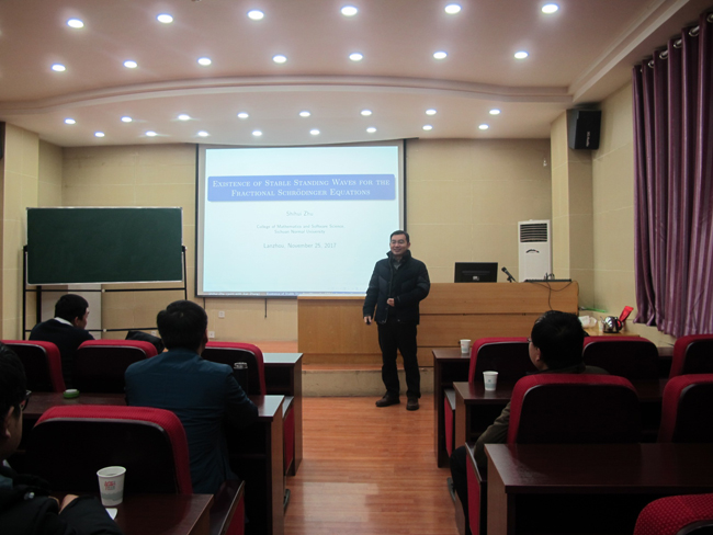 应学院邀请,四川师范大学朱世辉副教授于2017年11月23日到26日访问万象城,并在25日上午作了题为《Existence of Stable Standing Waves for the Fractional Schrodinger Equations with Combined Nonlinearities》的学术报告。相关专业教师、研究生共50余人参加了报告会。