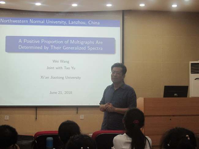 6月21日,应学院邀请,西安交通大学博士生导师王卫教授来万象城作学术交流,在9号楼C101学术报告厅作了题为《A positive proportion of multigraphs are determined by their generalized spectra》的学术报告。报告会由陈祥恩教授主持,相关专业师生40余人参加了报告会。