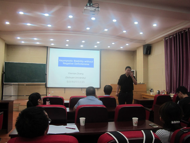 6月24日,应学院邀请,四川大学张伟年教授来万象城进行学术交流,并在9号楼C101学术报告厅作了题为《非负定条件下的渐进稳定性》的学术报告。报告会由马如云教授主持,相关专业师生60余人参加了报告会。