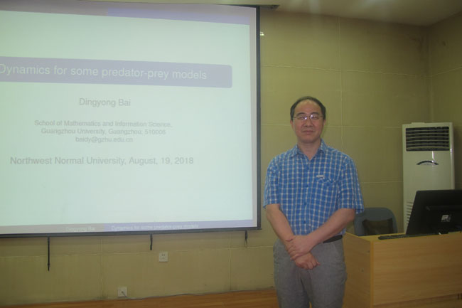 8月19日下午,学院邀请,广州大学白定勇教授在9号楼C101作了题为《几类捕食-食饵模型的动力学行为》的学术报告。报告会由马如云教授主持,相关专业师生约30多人参加了报告会。