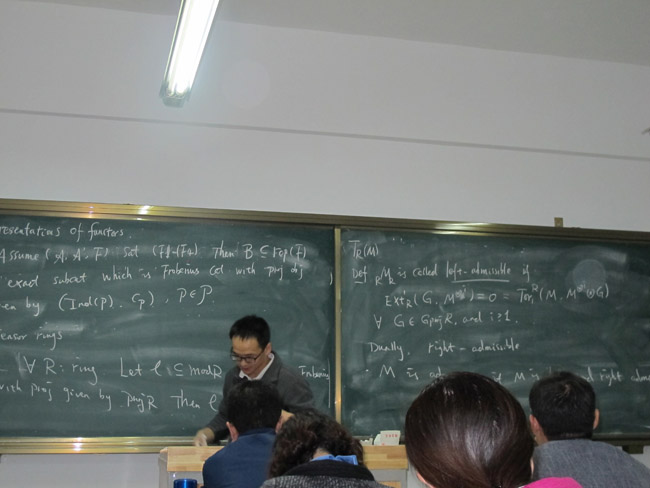 在第一场的报告中,卢明博士谈到了上三角矩阵环上的Gorenstein 投射模的构造,详细地讲解了一般Abelian 范畴上Frobenius子范畴的刻画,并在与双模相关的张量环上,对Gorenstein 投射模的子范畴给出了相关应用。在第二场报告中,卢明博士讲解了1-Gorenstein正分次代数上的Gorenstein 投射模的稳定范畴中的Silting对象的存在性,并在一些具体的例子上,描述了其相应的Tilting对象。