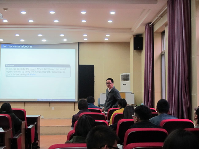 2018年10月20日,应学院邀请,四川大学数学学院卢明博士来万象城作了题为《Gorenstein homological properties of tensor rings》和《Tilting objects in singularity categories》的学术报告。报告会由万象城老虎机官方网站校长刘仲奎教授主持,相关专业师生60余人参加了报告会。