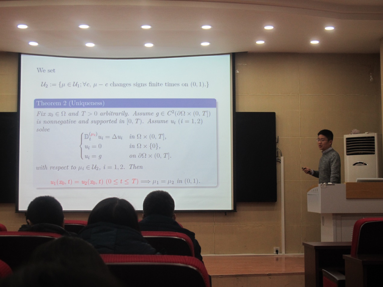 报告中,李志远副教授首先介绍了分布型分数阶扩散方程系数反问题的由来及物理背景,然后给出了系数反演问题的唯一性及稳定性结果,并且给出了证明此类问题的关键技术,最后对相关反问题的未来研究方向做了展望。
