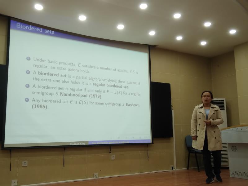 报告中,杨丹丹博士系统回顾了近年来自己在自由幂等生成半群方面的研究工作。杨丹丹博士利用半群的双续集理论,在自由幂等生成半群的研究方面取得重要进展,给出了一类重要的自由幂等生成半群的特征,并揭示了所取得的重要研究进展与群论的深刻联系,进一步揭示了幂等元在半群理论研究中的重要作用。