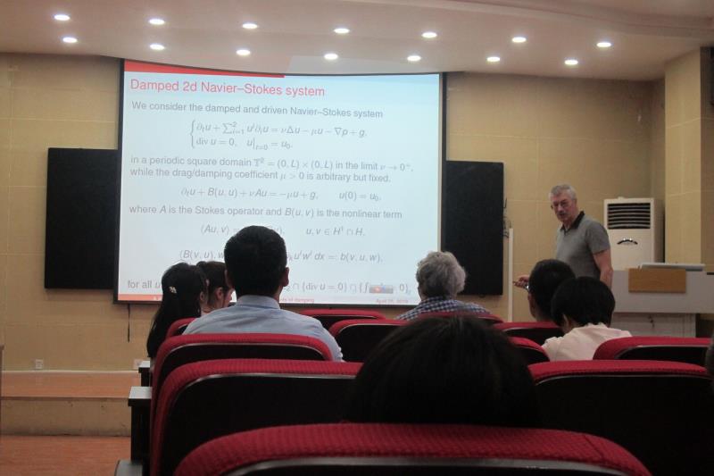 Alexey Ilin教授作了关于2维阻尼驱动的 Navier-Stokes系统在环、球以及无应力边界条件的有界域上全局吸引子的存在性及有限分形维数的报告。