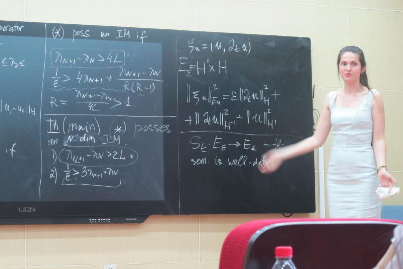 Anna Kostianko教授讲解了抽象抛物方程的双曲松弛问题,提出了构造惯性流形的新方法,并且获得了惯性流形存在的最优谱间隙条件。