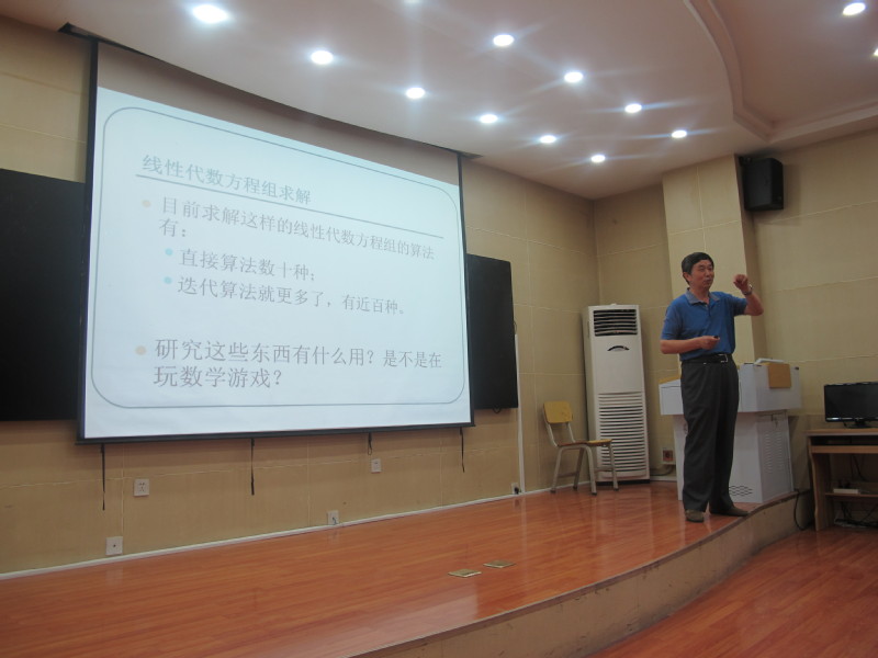 刘兴平研究员首先介绍了代数方程组求解的理论方法和数值算法,其次给出了油藏数值模拟、天气预报数值模拟等应用领域的大型线性方程组求解问题面临的问题和挑战,最后给出了对这些挑战的处理办法。报告结束后,刘兴平研究员就与会师生提出的相关问题作了解答。