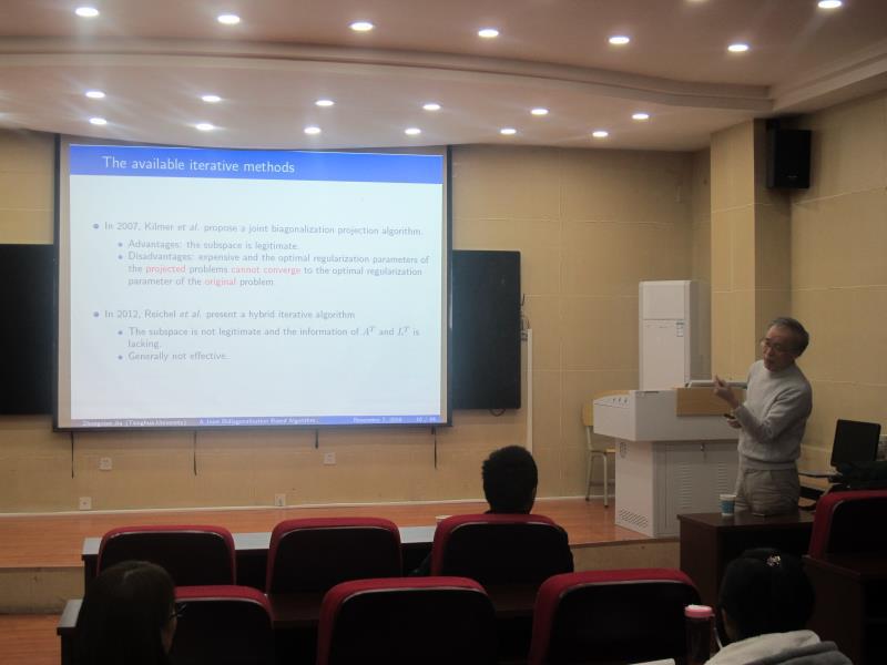 在报告中,贾仲孝教授主要介绍了基于矩阵对{A,L}的联合双对角过程,针对一般形式的Tikhonov正则化中的大规模线性离散不适定问题,提出了一种迭代正则化算法JBDQR,并给出了JBDQR的半收敛性,同时证明了JBDQR在理论上是可靠有效的,并且容易实现。报告结束后,贾仲孝教授就与会师生提出的相关问题作了解答,并与学院师生进行了广泛的交流和讨论。