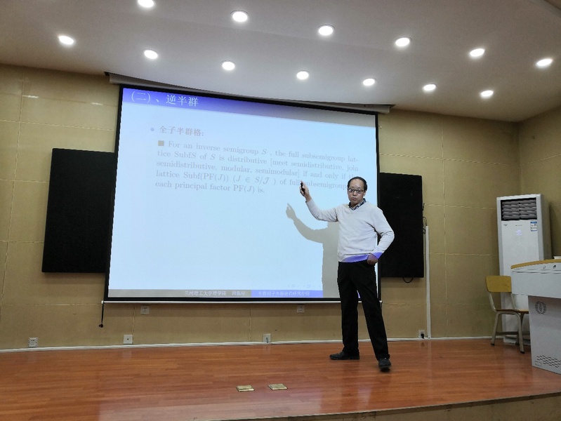 在报告中,田振际教授从格理论的大背景开始讲起,重点介绍了半群子半格相关理论,特别是逆半群及其推广的半群类的子半群的格的性质和研究进展。最后,结合自己的研究工作经历,田振际教授分享了自己的研究体会。报告结束后,田振际教授就与会师生提出的相关问题作了解答,并与学院师生进行了广泛的交流和讨论。