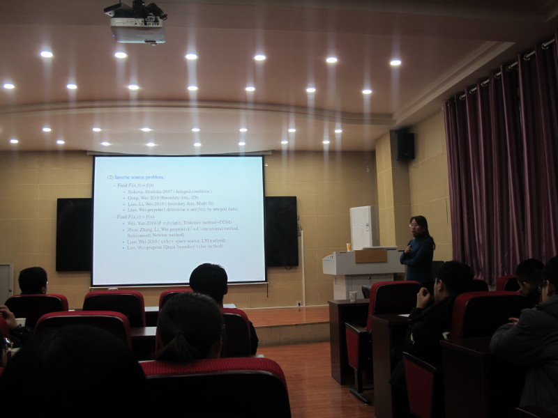 报告中,魏婷教授首先介绍了时间分数阶扩散波方程的研究进展,然后给出了课题组最新的研究成果,并且针对扩散波方程的反向问题及反系数问题,给出理论结果及数值方法,并分别列举若干数值例子来验证此类方法的正确性及有效性。