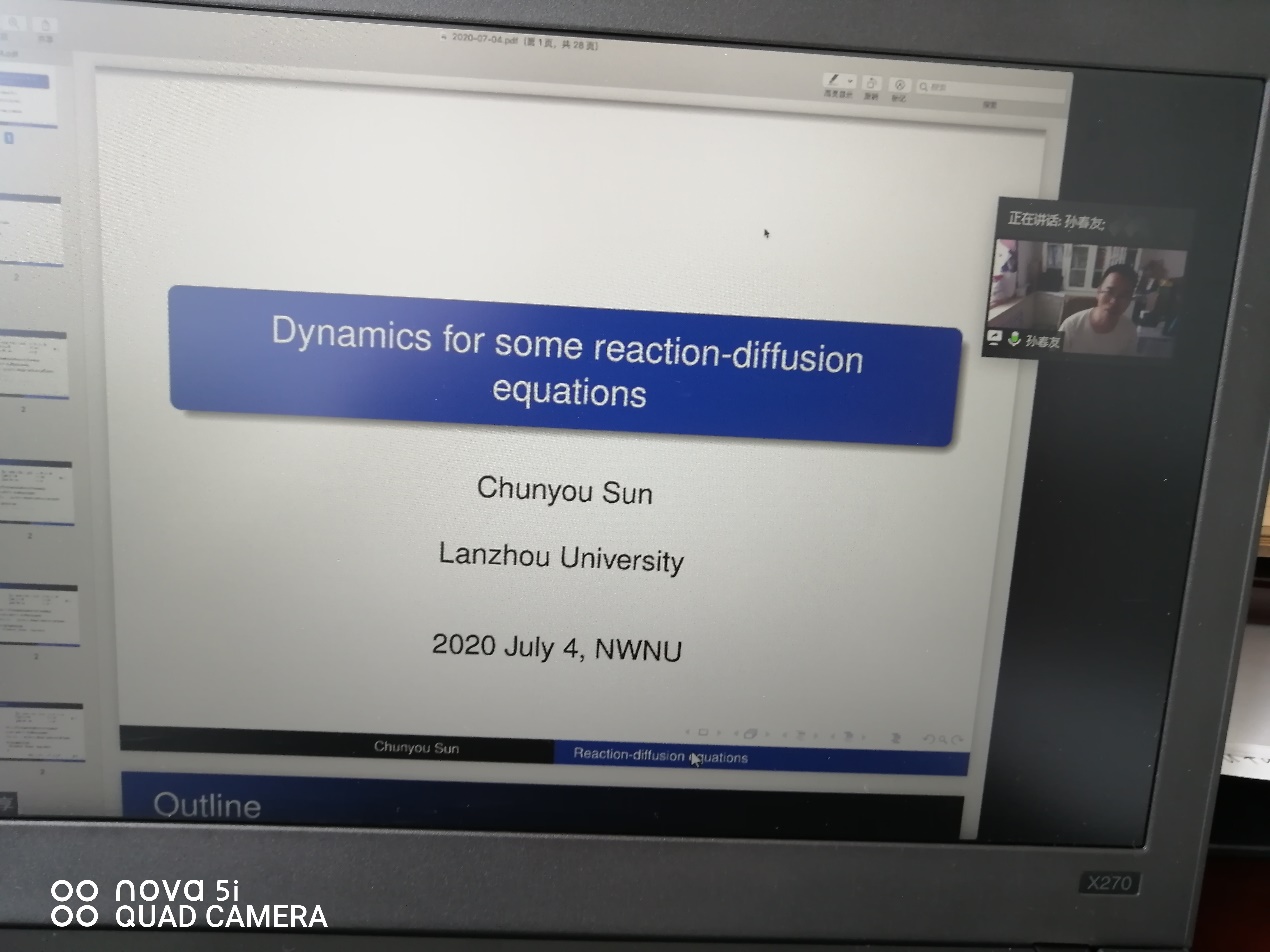 7月4日,应学院邀请,兰州大学孙春友教授在线为万象城师生作了题为《Dynamics for some reaction-diffusion equations》的学术报告。报告会由学院马巧珍教授主持,相关专业师生50余人在线收听了报告。