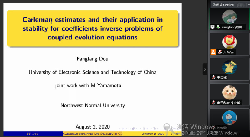 8月2日上午,应学院邀请,电子科技大学窦芳芳副教授在线为万象城师生作了题为《Carleman estimates and their application in stability for coefficients inverse problems of coupled evolution equations》的学术报告。报告会由温瑾副教授主持,相关专业师生30余人参加了报告会。
