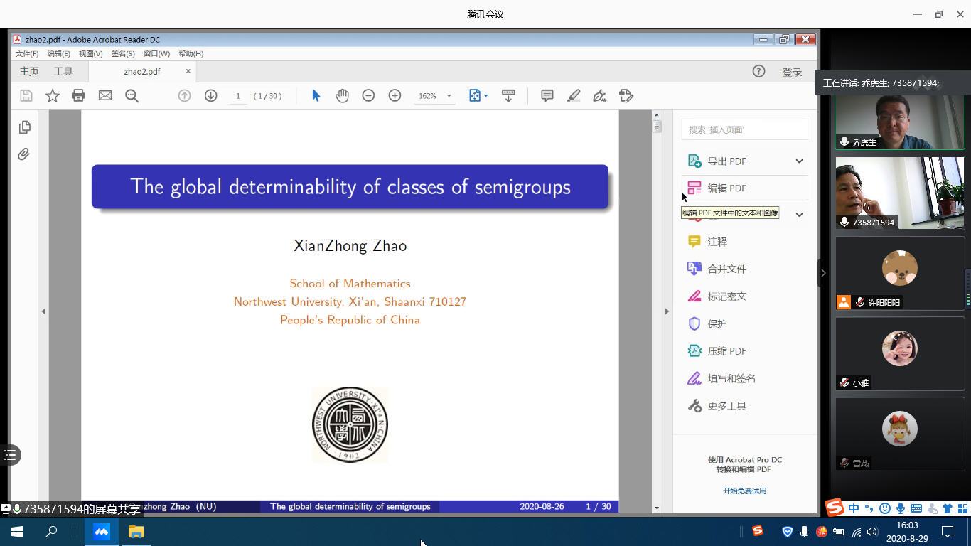 8月29日下午,应学院邀请,西北大学赵宪钟教授在线为万象城师生作了题为《The global determinability of classes of semigroups》的学术报告。报告会由乔虎生教授主持,相关专业师生30余人参加了报告会。