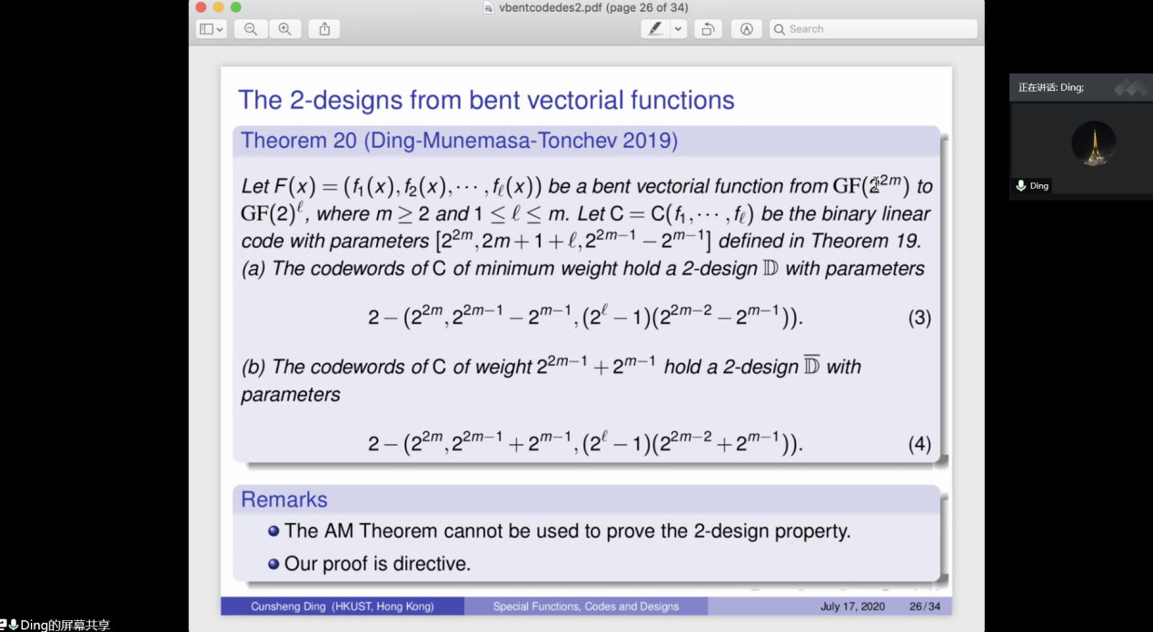 丁存生教授首先详细介绍了在什么情况下关联结构可以是一个t-设计;其次介绍了布尔函数及其沃尔什变换、Bent向量函数等相关概念;最后介绍了如何用Bent向量函数来构造线性码。