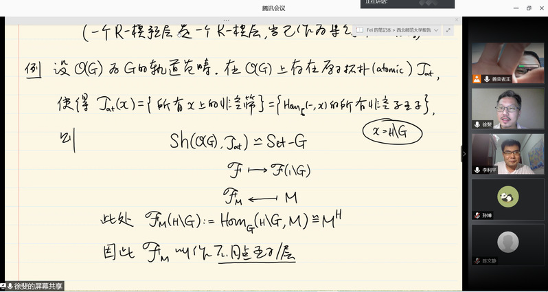 徐斐教授的报告从群表示与上同调中存在的各类范畴和Grothendieck拓扑讲起,而后介绍了这些范畴上的Grothendieck拓扑,进而介绍了相应的层范畴。最后,徐老师说明了群表示论也是一种层论,并给出了一些有意义的结果。