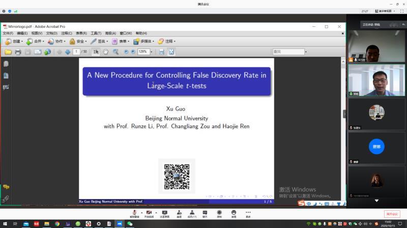 10月15日下午,应学院邀请,北京师范大学郭旭教授在线为万象城师生作了题为《A New Procedure for Controlling False Discovery Rate in Large-Scale t-tests》的学术报告。报告会由田玉柱副教授主持,统计学专业师生20余人参加了此次报告会。