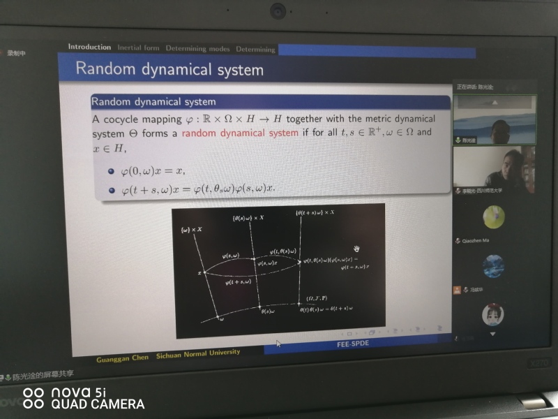 陈光凎教授详细介绍了随机偏微分方程解的动力学行为的复杂性。随机偏微分方程中噪声的影响使得系统的状态更加无法准确预测,状态空间的无限维使系统的几何直观和理论分析更加复杂,而空间变量中点的不可数性使得数值计算更加困难。陈教授从概念、方法以及理论分析和计算中应该注意的问题等方面做了详尽地讲解。