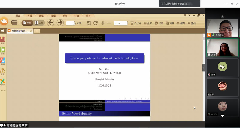 10月23日,应学院邀请,上海大学数学系高楠教授,在线为万象城师生作了题为《Some propetries for almost cellular algebras》的学术报告。报告由狄振兴副教授主持,相关专业师生40余人参加了学术报告。
