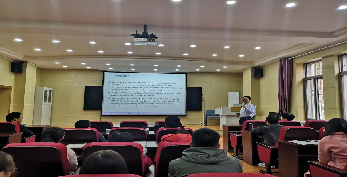 10月31日,应学院邀请,西安交通大学李继成教授来万象城进行学术交流,并在教学9号楼C101学术报告厅作了题为《Error bounds for linear complementarity problems》的学术报告。报告会由孟令胜副教授主持,相关专业师生30余人参加了此次报告会。