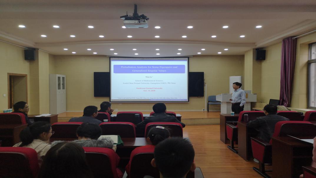 10月31日,应学院邀请,华南师范大学黎稳教授来万象城进行学术交流,并在教学9号楼C101学术报告厅作了题为《Perturbation analysis for eigenpairs and generalized singular value》的学术报告。报告会由刘建成教授主持,相关专业师生30余人参加了此次报告会。