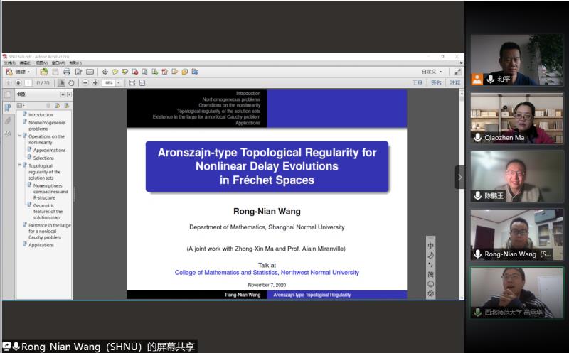 11月7日下午,应学院邀请,上海师范大学王荣年教授在线为万象城师生作了题为“Aronszajn-type Regularity for Nonlinear Evolution Equations with Multi-valued Perturbations”的学术报告。报告会由杨和副教授主持,相关专业师生30余人参加了报告会。
