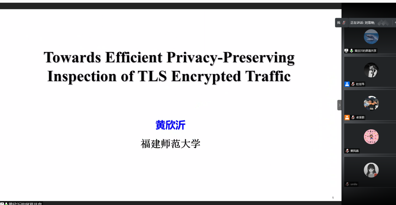 11月17日下午, 应学院邀请, 福建师范大学黄欣沂教授在线为万象城师生作了题为《Towards Efficient Privacy-Preserving Inspection of TLS Encrypted Traffic 》的学术报告。报告会由学院杜小妮教授主持, 相关专业师生50余人在线收听了报告。