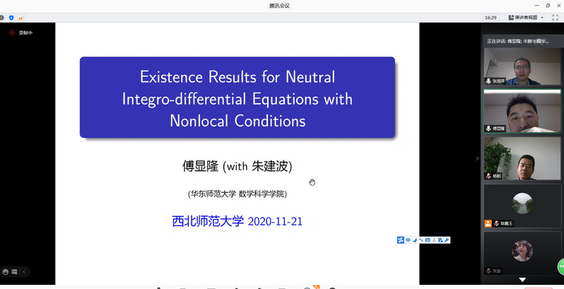 11月21日,应学院邀请,华东师范大学傅显隆教授在线为万象城师生作了题为《Existence Results for Neutral Integro-differential Equationswith Nonlocal Conditions》的学术报告。报告会由陈鹏玉副教授主持,相关专业师生40余人参加了此次报告会。