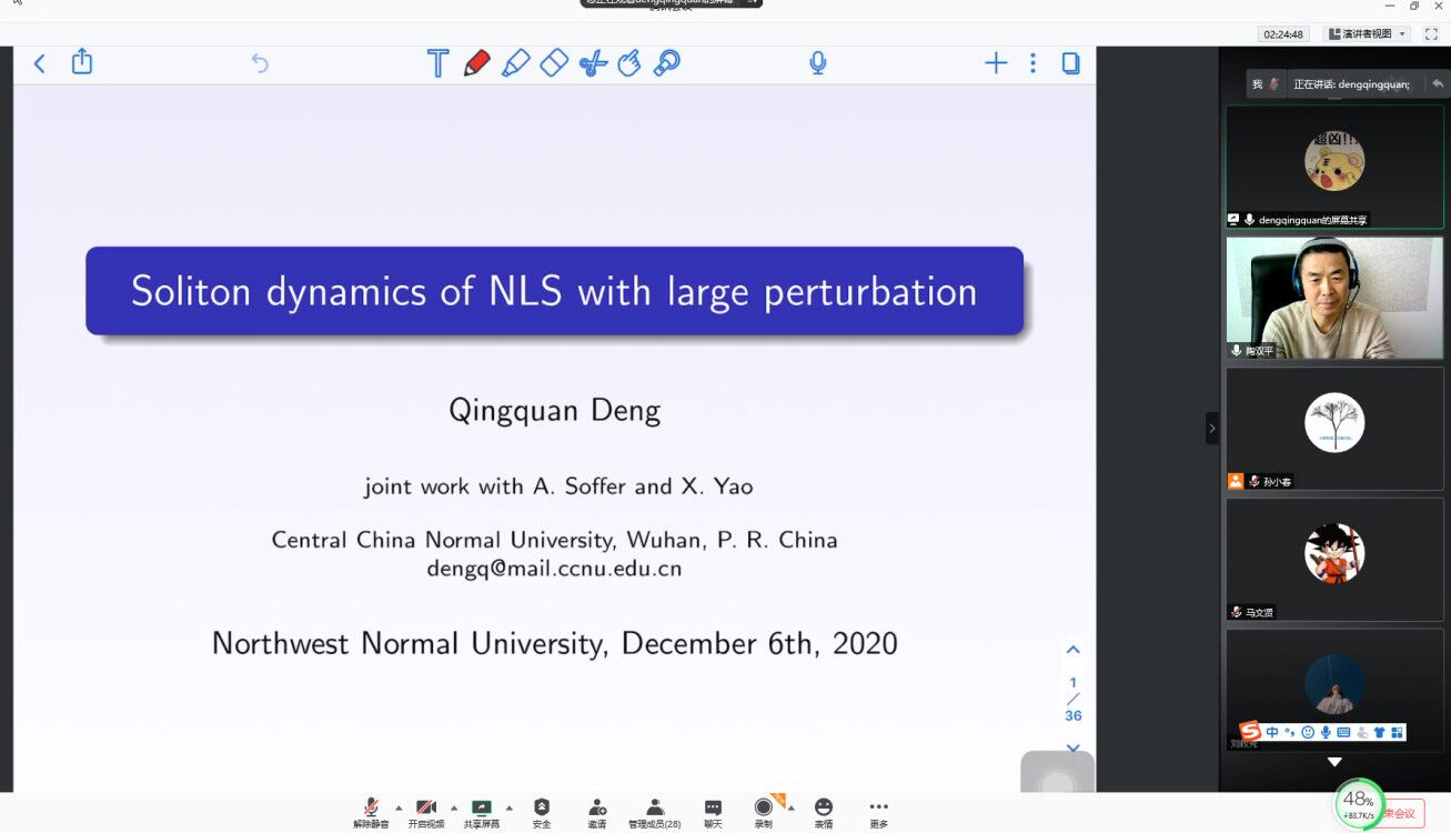 12月6日,应学院邀请,华中师范大学邓清泉副教授在线为万象城师生作了题为《Soliton dynamics for NLS with large perturbation》的学术报告。报告会由陶双平教授主持,相关专业师生50余人参加了此次报告会。