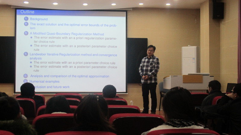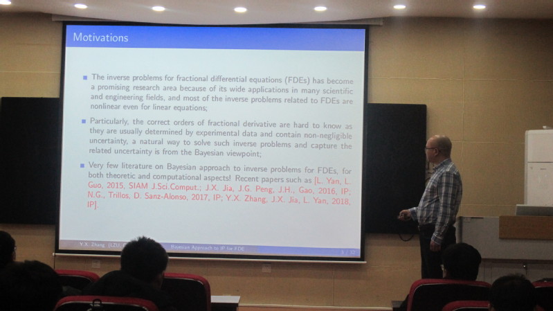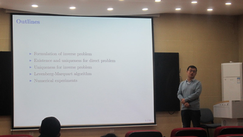 第一阶段的报告会上午9:00开始,报告会由温瑾副教授主持。杨帆副教授作了题为《Unknown source identification problem for time-space fractional diffusion equation》的报告,介绍了时间分数阶扩散波方程的背景意义和求解源项识别问题的两种正则化方法,并且给出了相关问题的精确解、条件稳定性以及误差估计。孙亮亮副教授作了《Simultaneous identification of the potential term and the fractional orders in a multi-term time-fractional diffusion equation》的报告,介绍了在时间分数阶扩散方程多参数反演问题,并给出了正反问题解的唯一性结果和相关反问题的Levenberg-Marquardt正则化算法。