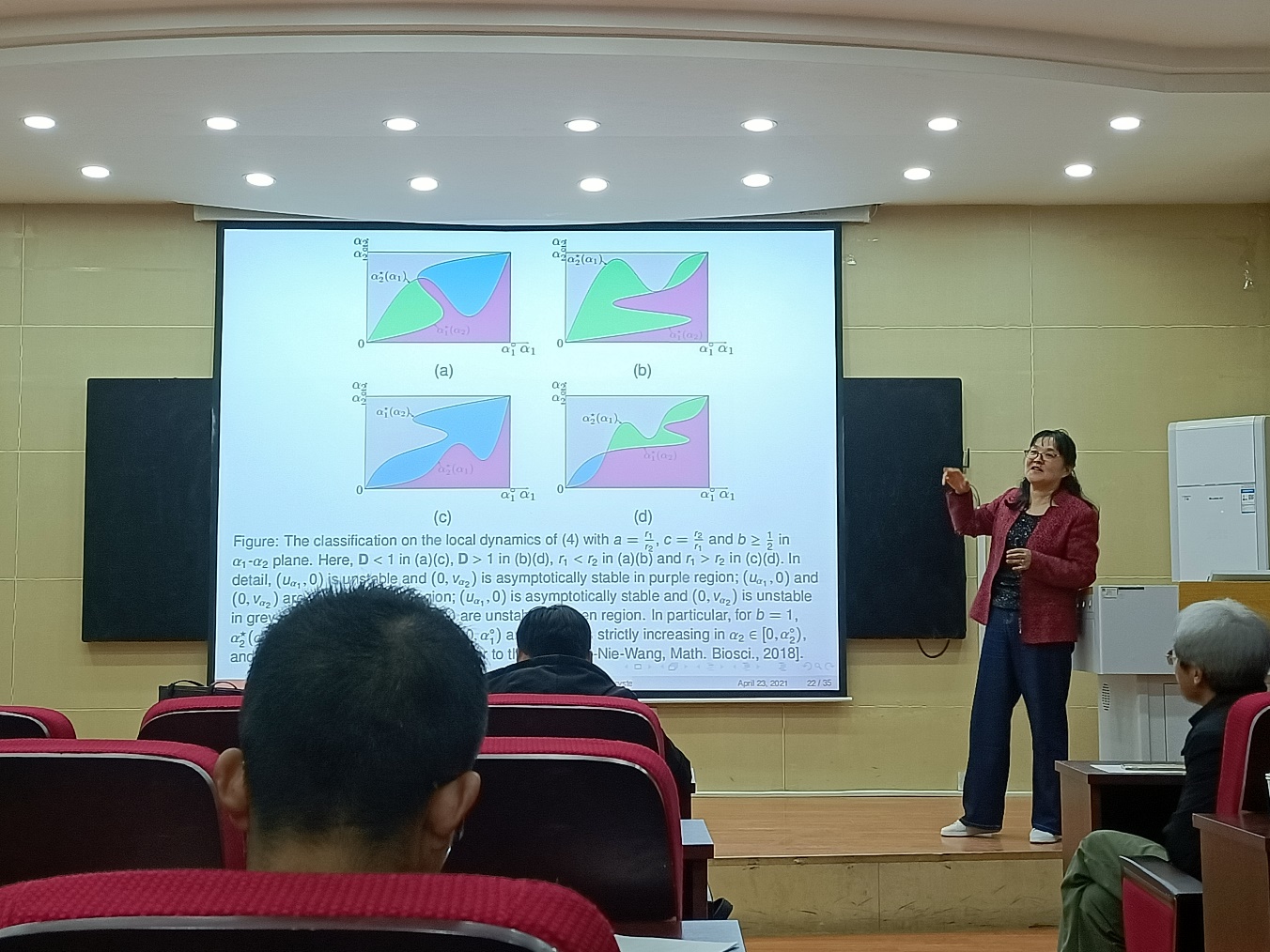 李艳玲教授首先介绍了一个反映河流环境中两种竞争物种相互作用的一般反应-扩散-对流模型的相关背景。然后将两种物种的对流率作为变参数,为全面理解局域动力学提供了一种有效的方法。结果表明,总是存在两条临界曲线,这两条曲线可以将竞争结果分为竞争排斥、双稳定性和共存。最后,作为进一步发展,假设当一个物种的对流率和扩散率的比率大于或等于其他物种时,其结果显示双稳态不会发生,但共存和竞争可能发生排斥。这些有趣的结果表明,对流运动在决定动力行为中起着关键作用。
