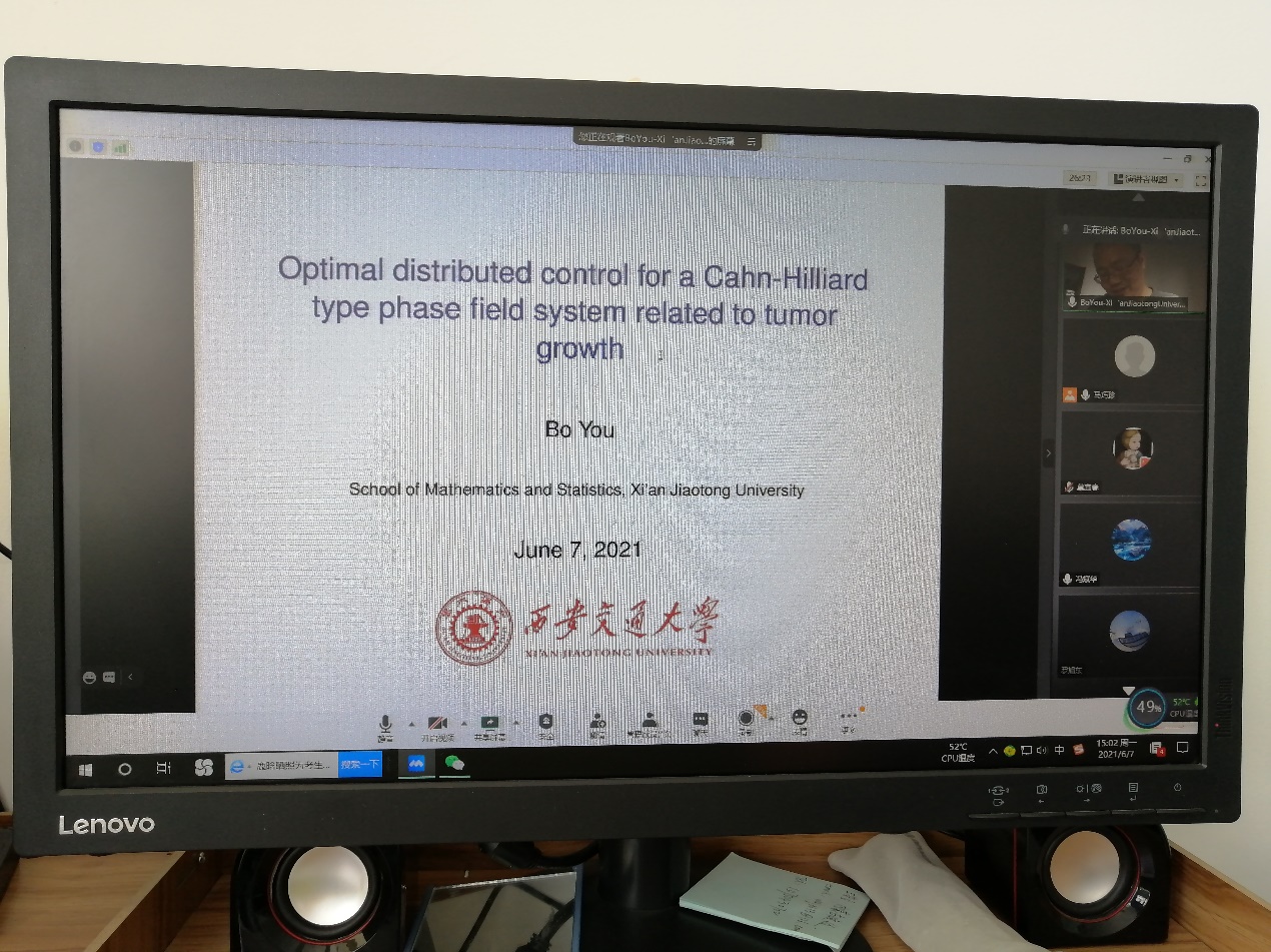 6月7日下午,应学院邀请, 西安交通大学万象城老虎机官方网站副教授、博士生导师尤波在线为万象城师生作了题为《Optimal distributed control for a Cahn-Hilliard type phase field system related to tumor growth》的学术报告。报告会由学院马巧珍教授主持,相关专业师生30余人在线收听了报告。
