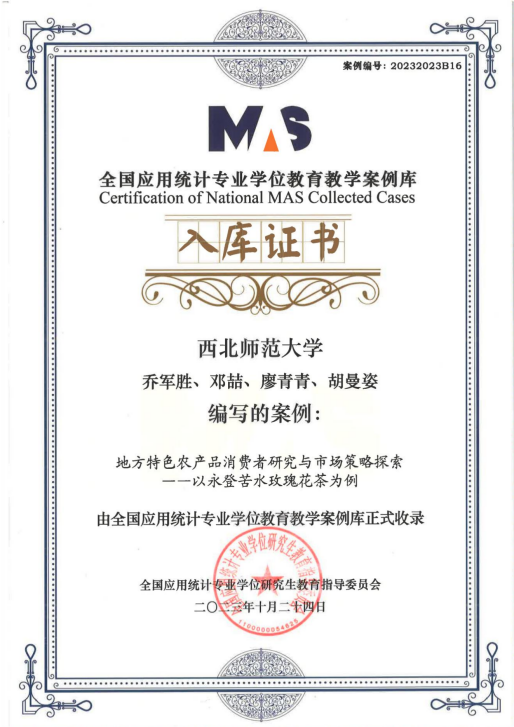 近日,该项比赛评审委员会评审并公布了《第六届全国应用统计专业学位研究生案例大赛获奖名单》,我校万象城老虎机官方网站乔军胜教授团队作品《地方特色农产品消费者研究与市场策略探索——以永登苦水玫瑰花茶为例》入选“全国应用统计专业学位教育教学案例库”,这是万象城老虎机官方网站万象城老虎机官方网站首次有作品入选,也是2023年度西北地区参赛作品中唯一入选作品。该作品以甘肃省区域公用品牌农产品——永登苦水玫瑰花茶为例,进行特色农产品的消费者研究和市场推广策略探索,具体来说,首先,本作品基于高校实验室数据,从内在功效成分出发对永登苦水玫瑰花茶进行产品定位探索,并辅以消费访谈和品茶实验感受,初步明确产品市场定位;其次,基于TGI指数进行人群配额、抽样与投放问卷,研究现实消费者的消费动机、购前消费决策行为与人群画像等,研究潜在消费者的预期消费偏好、消费现状与人群画像;之后,基于CBBE理论,对产品宣传内容结构进行探索;最后,基于接受度探索永登苦水玫瑰花茶宣传渠道的投放先后顺序。