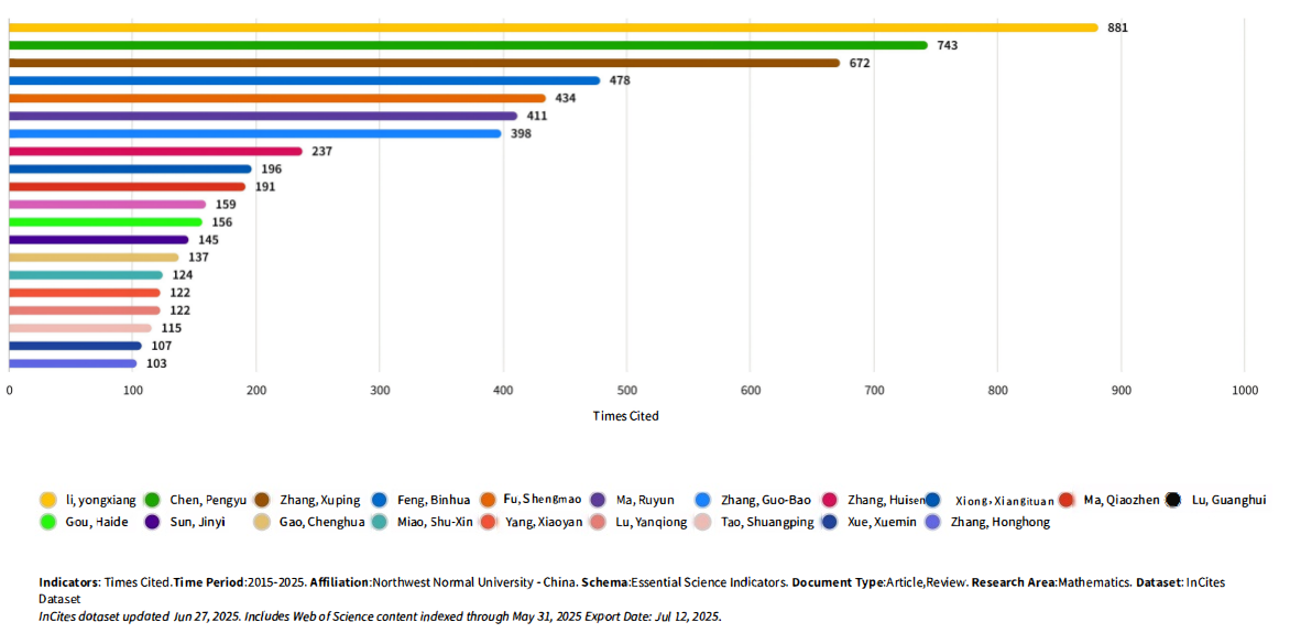 根据科睿唯安(Clarivate Analytics)于2025年7月10日公布的ESI(Essential Science Indicators,基本科学指标数据库)最新数据显示,西北师范大学数学学科新晋为ESI全球前1%学科。这标志我校在数学学科领域迈入了国际高水平行列,实现了学科建设的新突破。