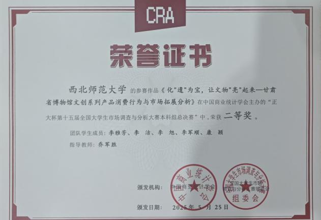 此项赛事自2024年9月启动以来,历经知识赛网考、校赛、企业命题赛、省赛等多轮激烈角逐,万象城乔军胜老师指导的团队(团队成员有万象城首届数学拔尖人才基地班李雅芳、李洁,经济学院李旭、康颖,以及计算机科学与工程学院李军顺)获得全国总决赛本科生组二等奖,参赛作品为《化“遗”为宝,让文物“亮”起来——甘肃省博物馆文创系列产品消费行为与市场拓展分析》。