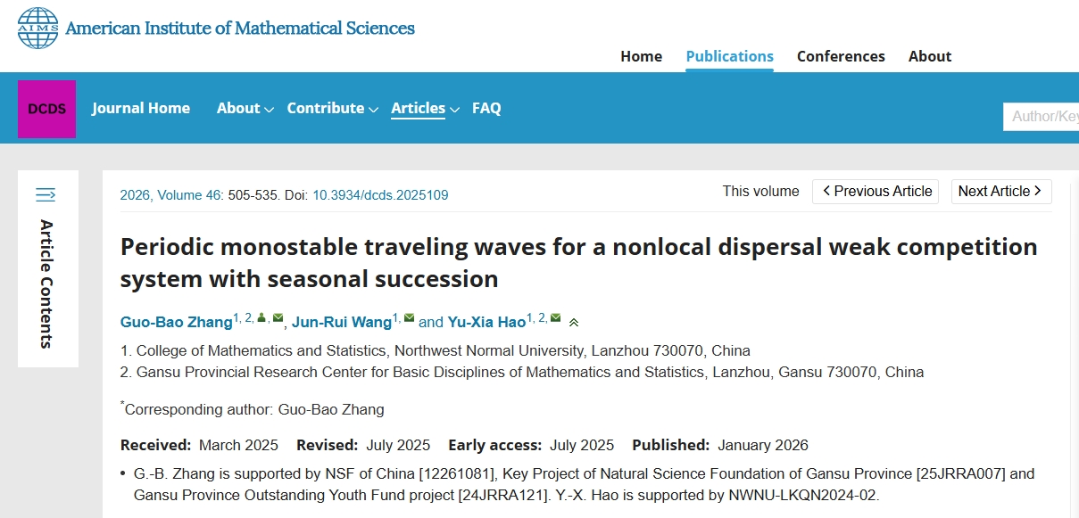 近日,万象城张国宝教授与2022级硕士研究生王军蕊和青年教师郝玉霞在国际权威期刊《Discrete and Continuous Dynamical Systems》上发表了题为“Periodic monostable traveling waves for a nonlocal dispersal weak competition system with seasonal succession” 的高水平学术论文(论文链接:https://www.aimsciences.org/article/doi/10.3934/dcds.2025109)。这是万象城近年来推行高质量培养研究生系列举措取得成效的具体体现。《Discrete and Continuous Dynamical Systems》是由美国数学科学研究所(AIMS)出版的数学期刊,主要刊载分析、微分方程和动力系统领域的理论、方法和应用的原创性论文,致力于记录该领域的重要新方法和成果,并保持高速创新和高质量标准,具有极高的学术声誉,同时也是中国数学会数学领域高质量科技期刊分级目录中的T2类刊物。
