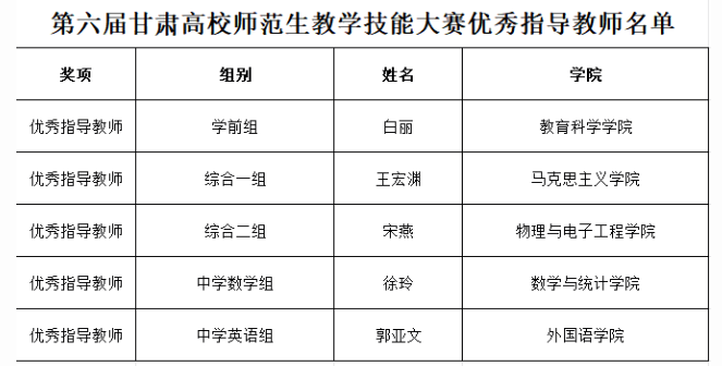 此次教学技能大赛从6月份启动,经过学院选拔赛、学校初赛、到省级比赛,层层选拔和各阶段培训,历时5个月时间,终于圆满落幕。刘兵兵同学在各级比赛中一直表现优异,曾获得学院一等奖和学校二等奖。作为连续两届教学技能比赛的优秀指导教师,徐玲老师凭借丰富的教学指导经验,不仅为参赛学生制定了非常完善的培训计划,多方位进行指导,还带领着学生到中学进行教学实践,让学生能够理论与实践结合,全面提高教学水平。